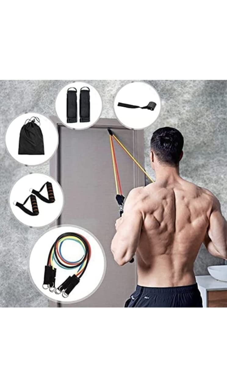 Five Levels 11pcs Resistance bands : Adjustable Resistance Bands, Maximum equivalent of 150 lbs – Comes as a set of 5, 48-inch long colored exercise bands: Yellow (10 lbs),Blue (20 lbs), Green (30 lbs), Black (40 lbs), Red(50 lbs). All bands can be combined together to provide up to 150 lbs